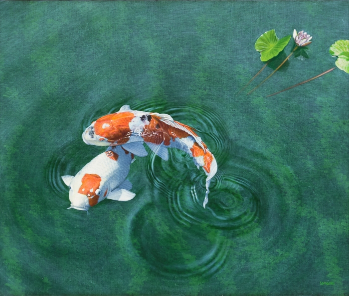 青山繁の錦鯉が棲む池の清らかな水は、年々その存在感を増している。画家の筆のもと、時代を超え、国を超えて多くの象徴的機能を担ってきた水の要素は、人類史以前、信仰以前からの根源的な透明性を再発見する。鯉の池は宇宙の縮図であり、原初の調和を求めて人間が再構成した原始の海ではないだろうか。生まれ、成長し、愛し合い、結ばれ、語り合う幸福を羨みながら、のんきに滑るように泳ぐ繊細な魚に共感せずにはいられない。鯉が動く度に、波はその動きに同調し、普遍的なダンスを踊るようだ。あらゆるものに反響する水の動きは、画家がそのヴィジョンとテクニックによって、その愉快な明瞭さのすべてを書き写す生命のダンスと言えるだろう。