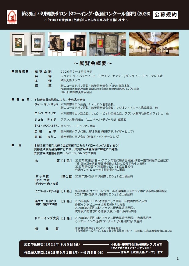 | 審査(両部門共通) | 「パリ国際サロン」は推薦展のため推薦された作家のみ出品可(自己推薦あり)。 「ドローイング・版画コンクール部門」は公募展。公募審査あり。 賞審査は両部門共通。 |