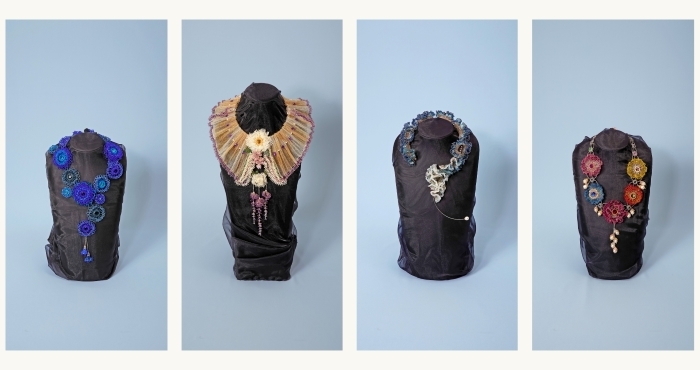 (中央2点) 川﨑 永子 「『雅』光る君へ~アメジストより」工芸(ビーズ)28.0×19.0×48.0 他1点